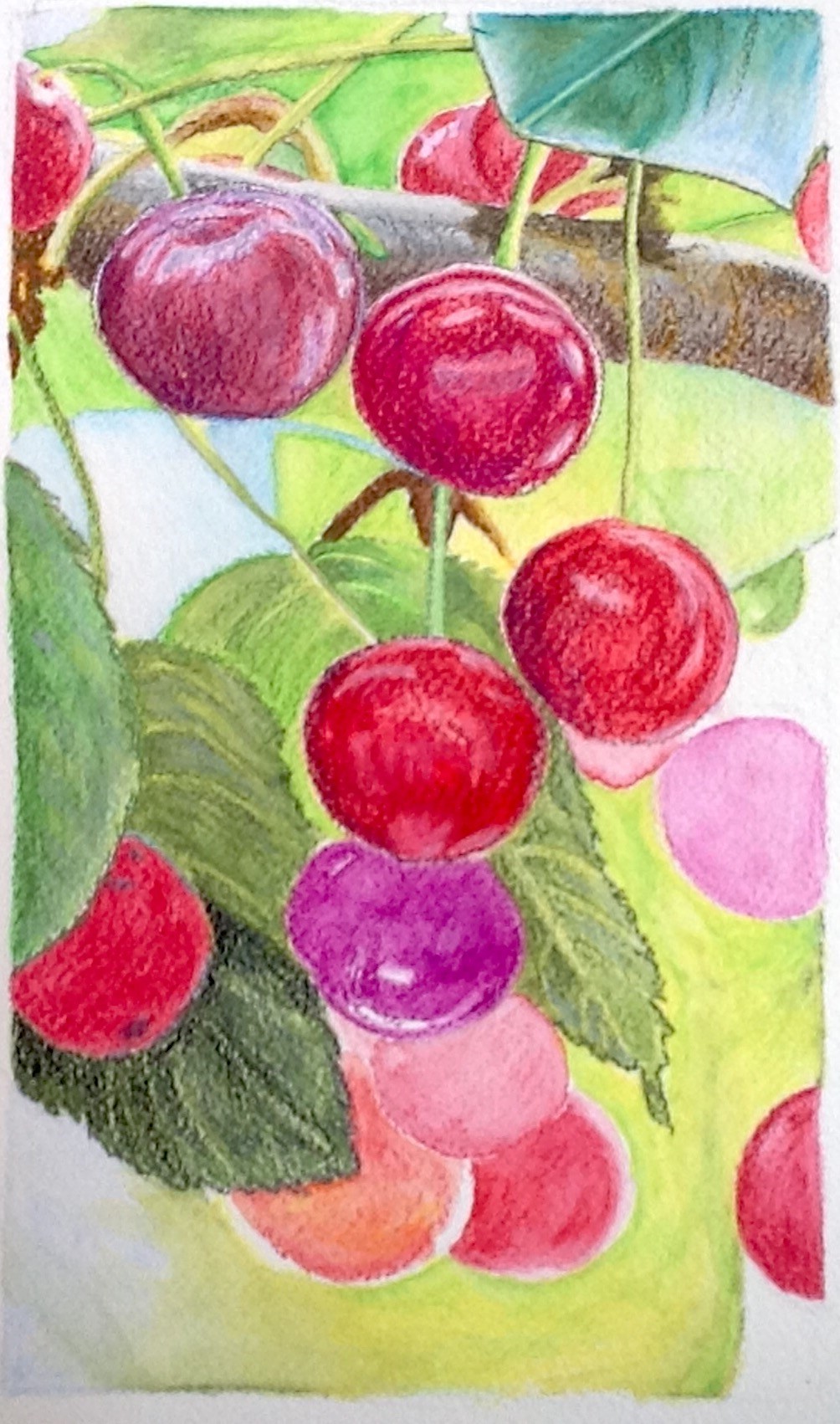 Bob Ross called mistakes happy accidents...  This is unfinished and I have gone farther but the mistake here was that the masking fluid that I used on 3 of the cherries refused to lift off after the paint was dried.