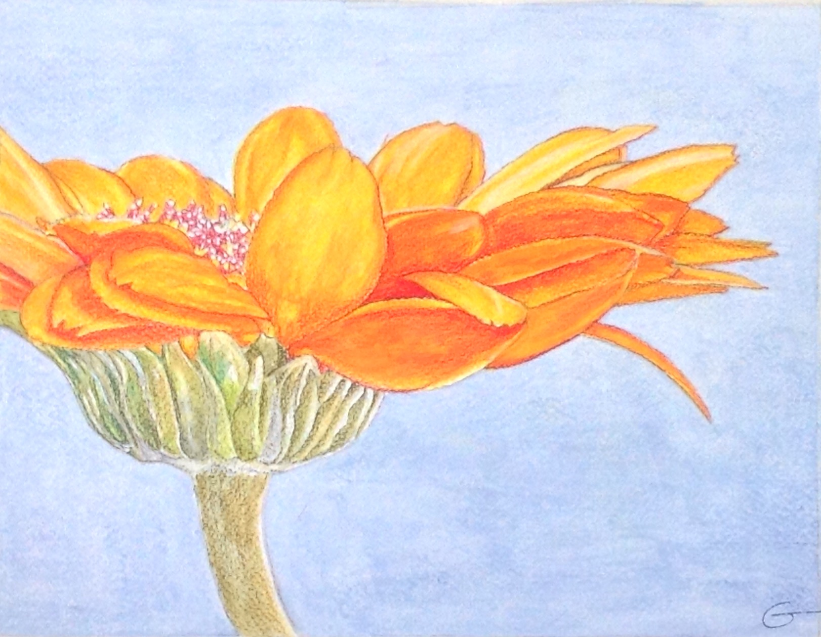 The photo does not do justice to the vibrancy of the medium. The flower is quite orange. Done with Derwent Inktense both pencils and blocks on Fabriano 140 lb cold-pressed watercolour paper.