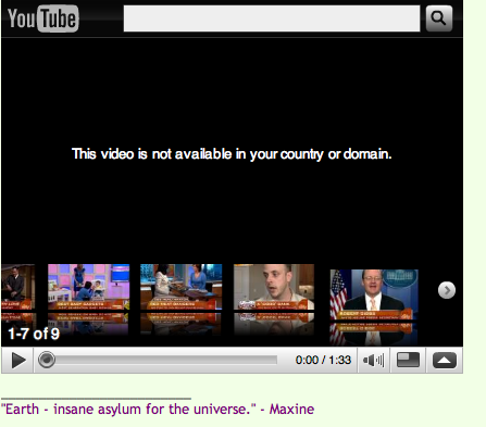 Administrators Tom Wetmore Posted March 24, 2009 Administrators Posted March 24, 2009 Apparently it is too funny for Canada... :smile: Quote "Absurdity reigns and confusion makes it look good." "Sinless perfection is such a shallow goal." "I love God only as much as the person I love the least." *Forgiveness is always good news. And that is the gospel truth. (And finally, the ideas expressed above are solely my person views and not that of any organization with which I am associated.)